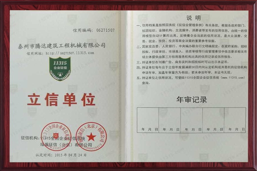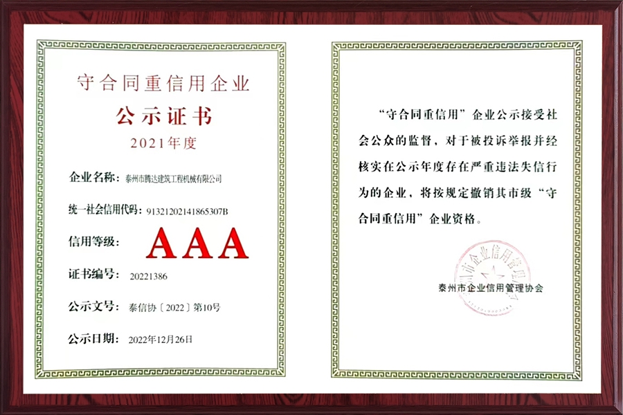 公司先后獲得多項發(fā)明專利和實用新型專利。公司通過了ISO9001:2000質量體系認證,產(chǎn)品質量穩(wěn)定,先后獲得:《江蘇省質量信譽雙十佳企業(yè)》、《江蘇市場公認名牌產(chǎn)品》,全國工程機械產(chǎn)品質量《用戶滿意企業(yè)》和《用戶滿意服務企業(yè)》等榮譽;獲得江蘇省《信用貫標企業(yè)》,《泰州市信用貫標示范企業(yè)》稱號,連續(xù)十多年被評為《泰州市重合同、守信用企業(yè)》;公司各項經(jīng)濟技術指標持續(xù)發(fā)展提高,在江蘇同行業(yè)中名列前茅,成為泰州市地方的新興企業(yè),先后獲得《江蘇省十佳民營企業(yè)》、《江蘇省明星企業(yè)》、海陵工業(yè)園區(qū)《十強工業(yè)企業(yè)》和《優(yōu)秀工業(yè)企業(yè)》等。